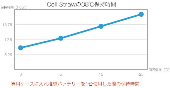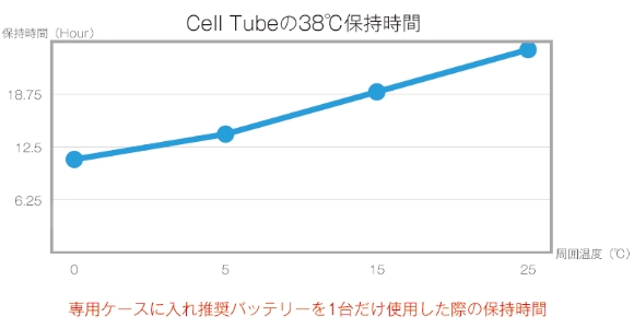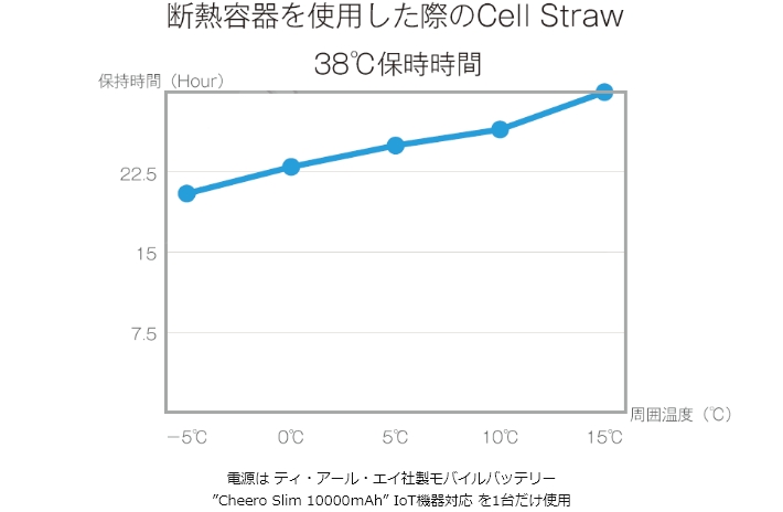 弊社は、セルボックスを持ち運ぶために、市販の断熱箱を3種類選びました。それぞれの断熱箱で、セルボックス内の温度を38℃に設定し、保持時間を測定しました。測定⽅法は、断熱箱にセルボックスを⼊れ、異なる周囲温度下で、38℃を保持する時間を測定しました。モバイルバッテリーにはCheero